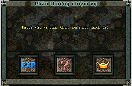 Tùy theo độ khó của nhiệm vụ, Dã Tẩu sẽ tặng bạn những phần thưởng có giá trị tương ứng với 3 nhóm phần thưởng để bạn chọn. Dựa vào nhu cầu của bạn và tùy vào các phần thưởng mà Dã Tẩu tặng, bạn hãy chọn phần thưởng nào mà bạn thấy phù hợp.